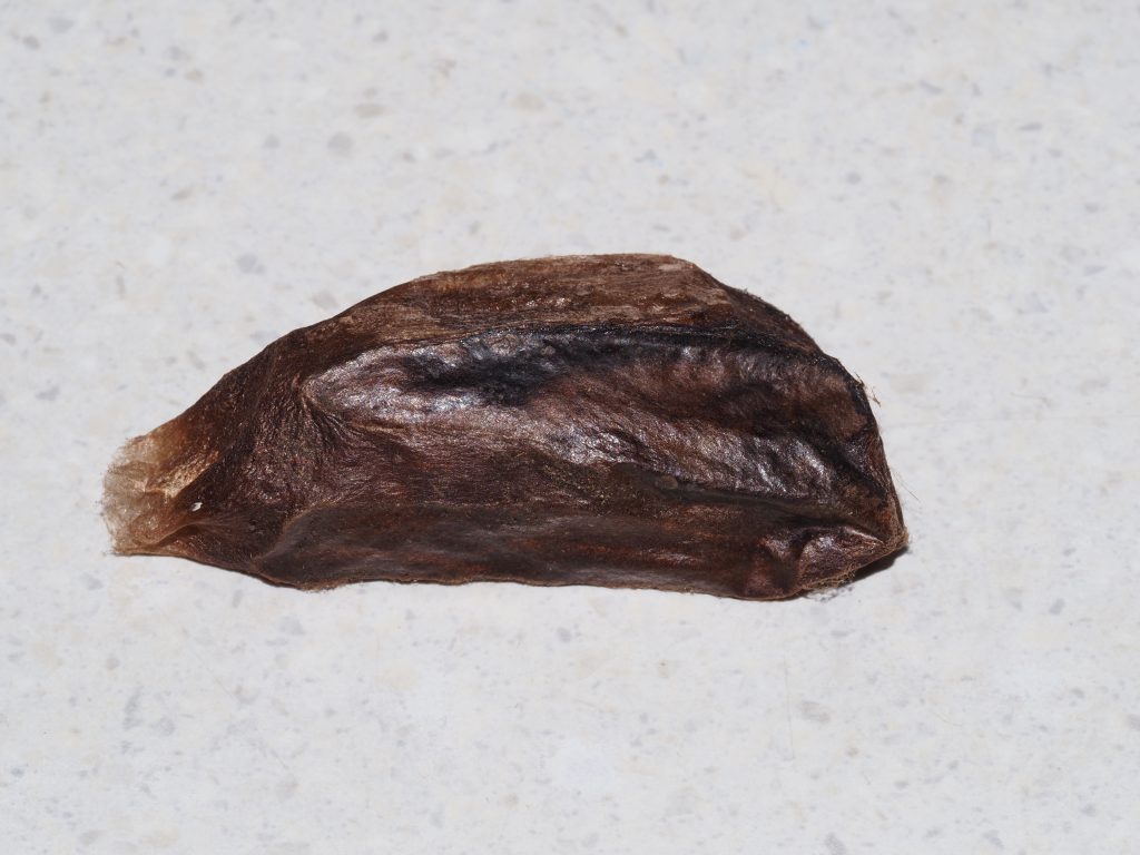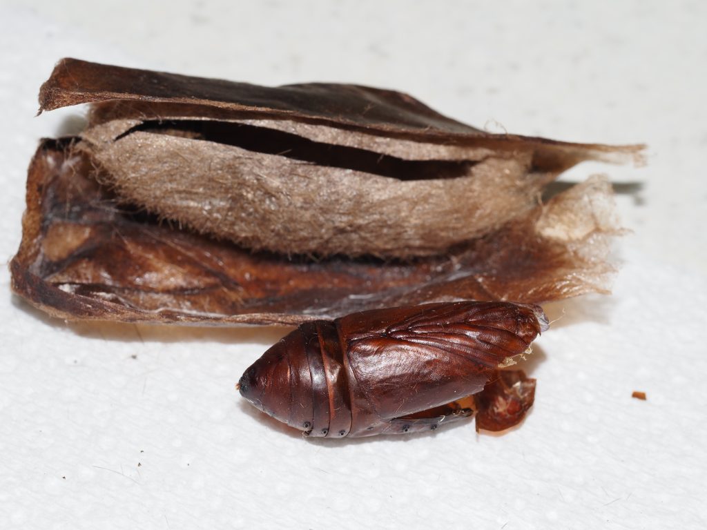 In mid October 2025, we found a cocoon here in a pile of plastic tree guards (sleeves) which were lying on the ground. The sleeves were in a kikuyu paddock which now increasingly has native grasses and ground dwelling native herbs germinating as well, following the removal of cattle in 2016. Further, we planted approximately 50 young Acacia melanoxylon trees in this paddock in 2018 as the first step towards converting the paddock back to rainforest.