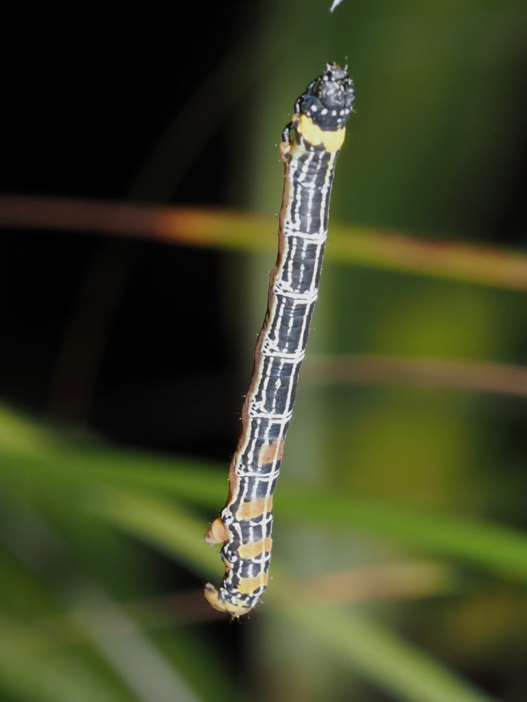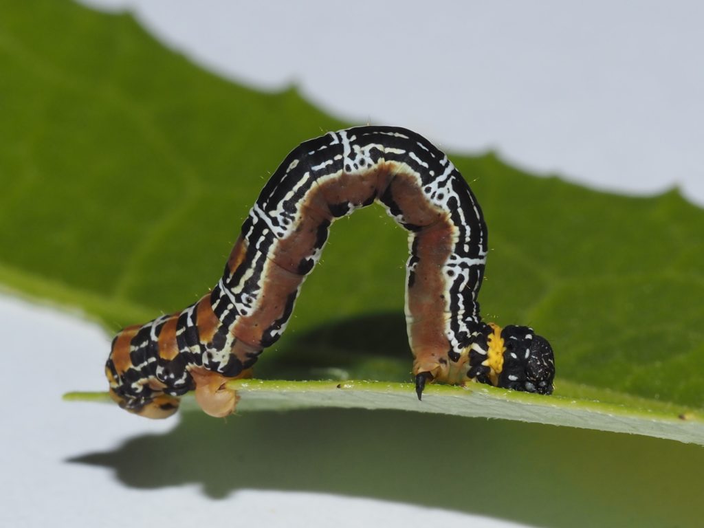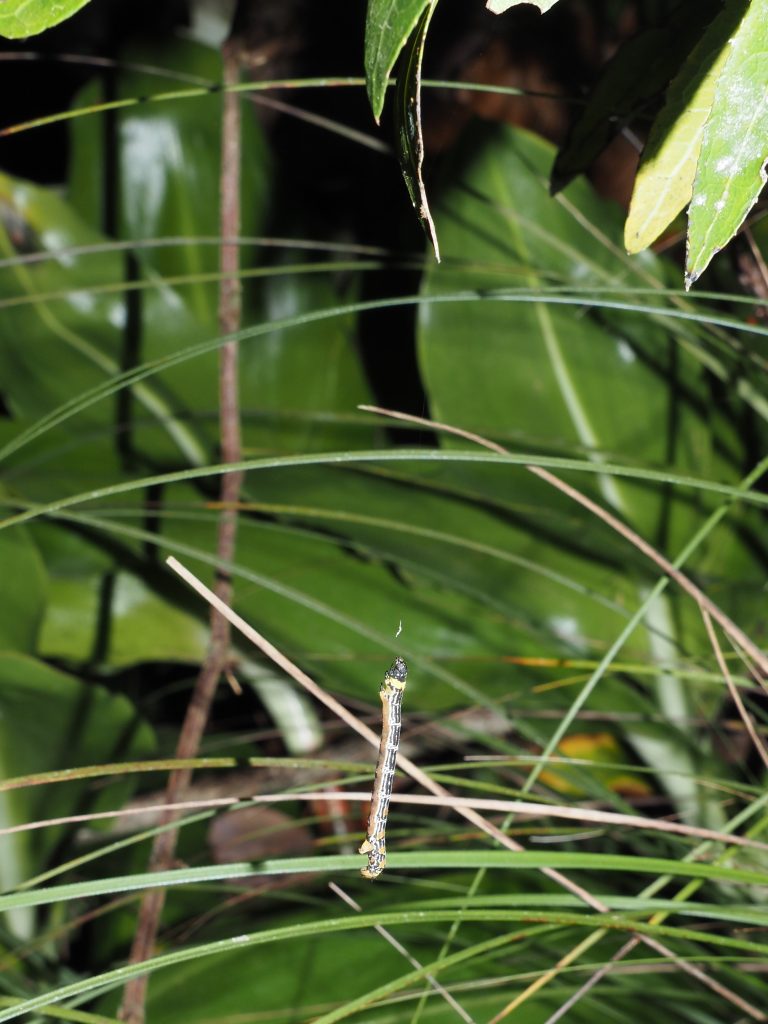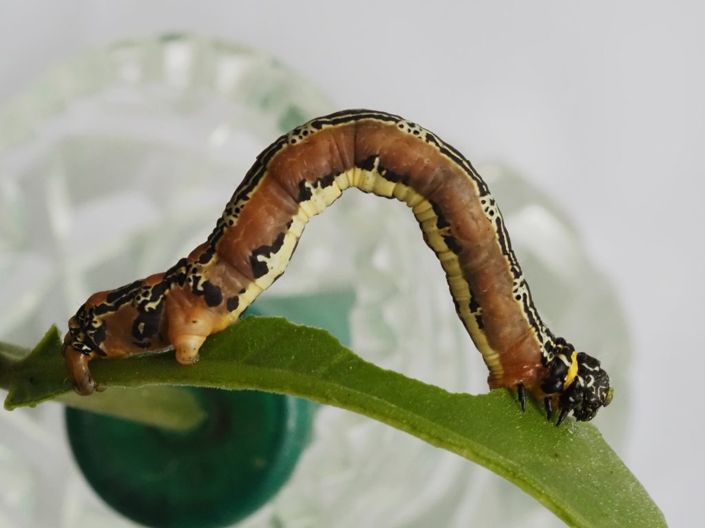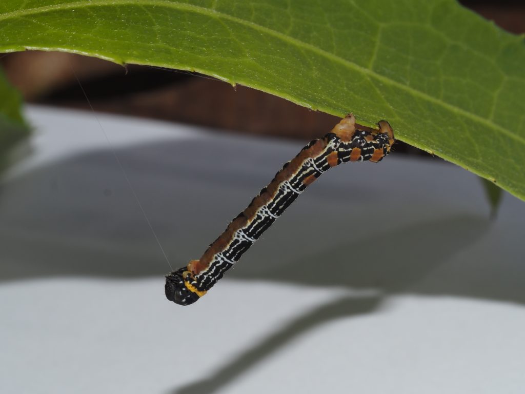 The looper caterpillar feeds on new growth at night, even eating the new stem and often hanging on a web from the foodplant.