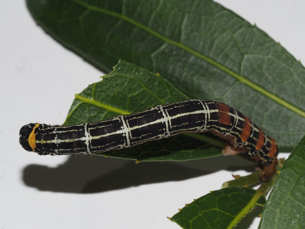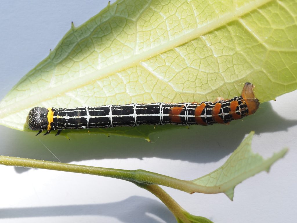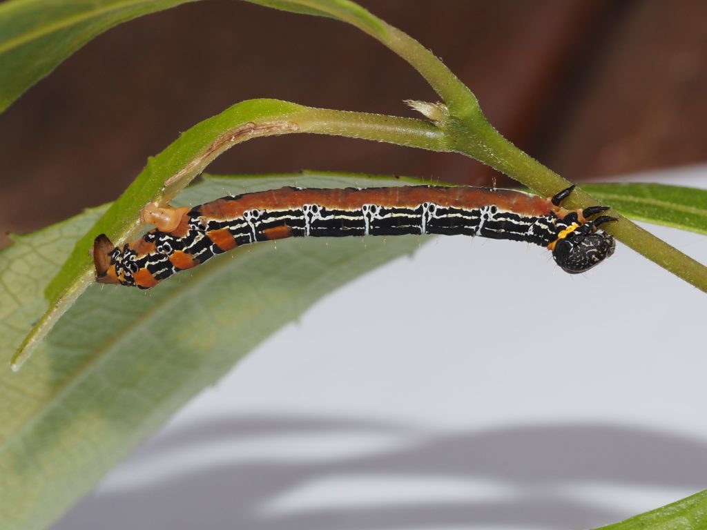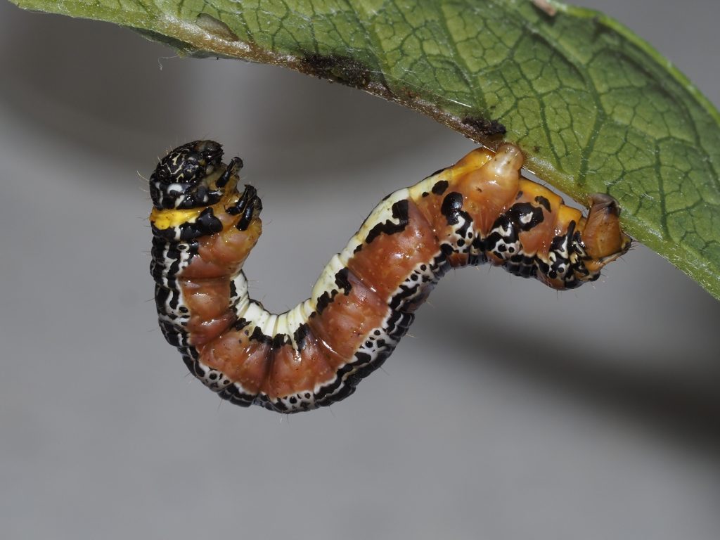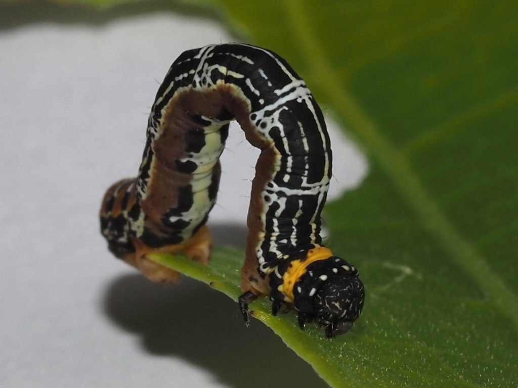 The looper caterpillar feeds on new growth at night, even eating the new stem and often hanging on a web from the foodplant.