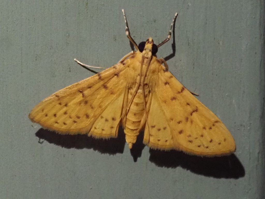 Conogethes punctiferalis, the Yellow Peach Moth, is found in Western Australia, Northern Territory, Queensland and New South Wales. We have seen this moth in January and February.