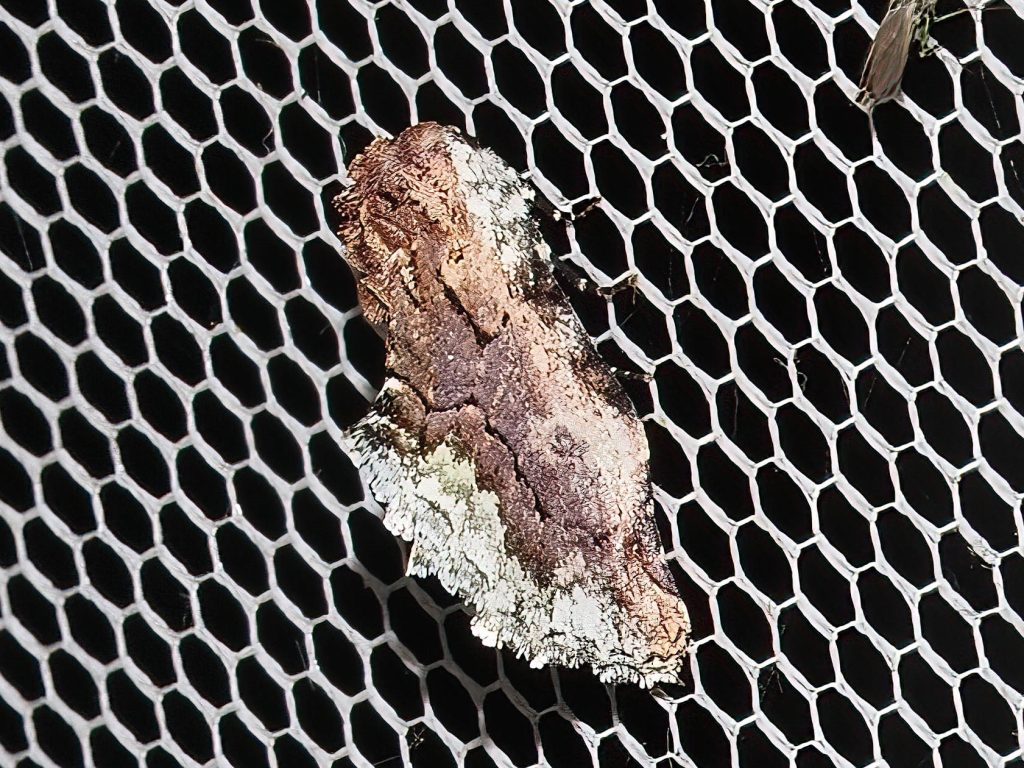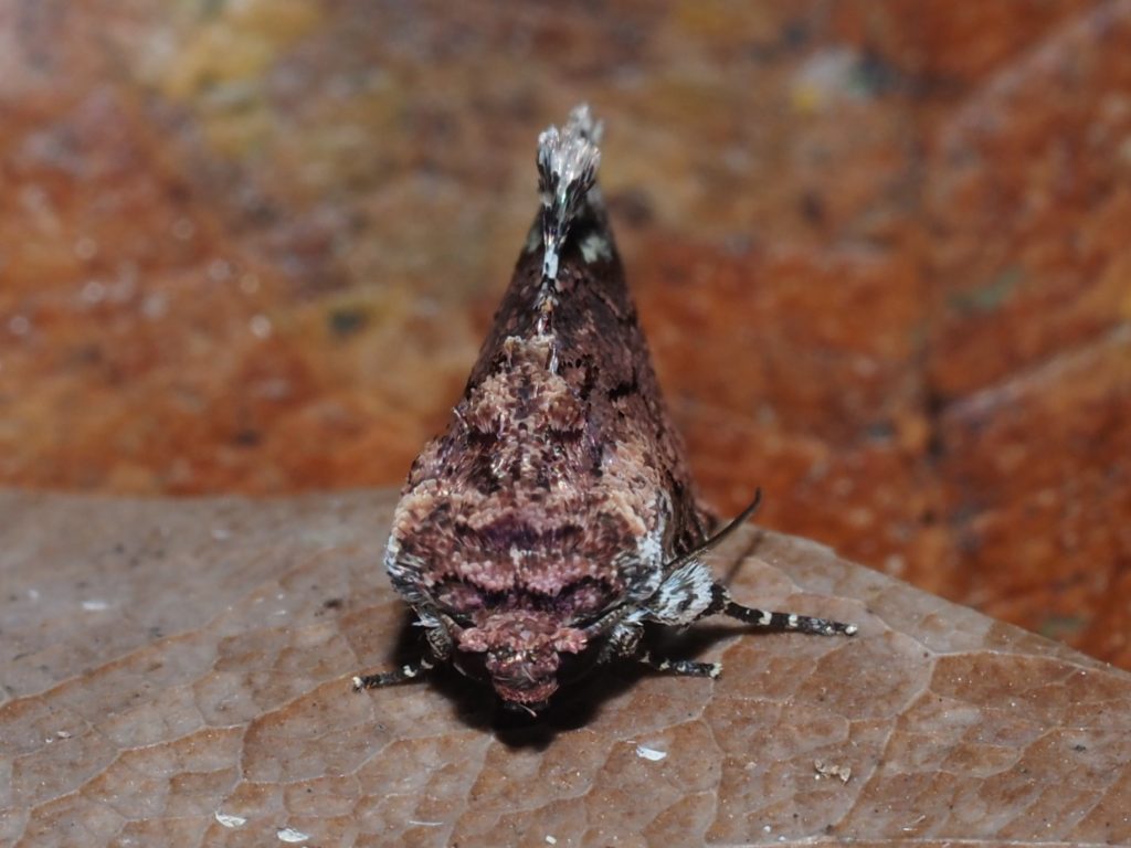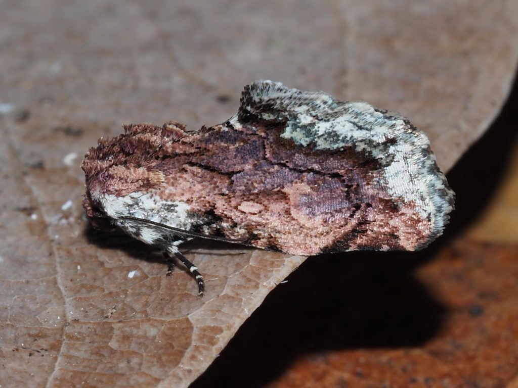 Parerastria castaneata is found in southern Queensland and New South Wales. We have seen this moth in January and February. It is a small moth that looks very like a piece of licheny leaf litter.